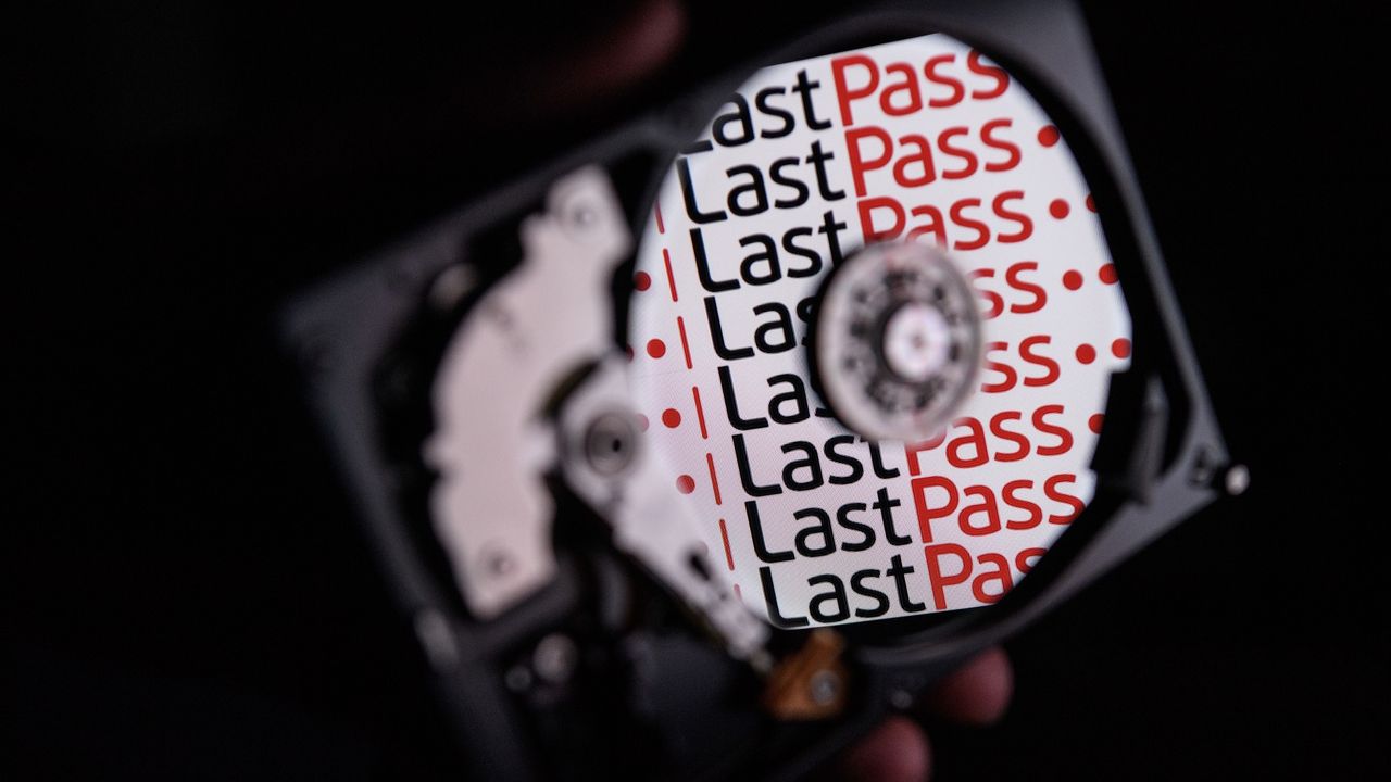 The logo for online password manager service "LastPass" is reflected on the internal discs of a hard drive.
